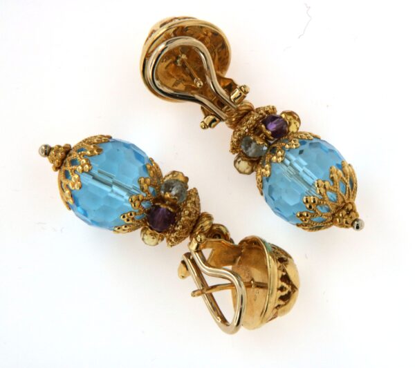 Orecchini pendenti in oro giallo 18ct 750/°° lavorazione merletto traforato. Motivo centrale topazi azzurri sfaccettati, corona superiore con quarzi multicolor alternati. Attacco a lobo mezza bull a clips lavorazione artigianale italiana.